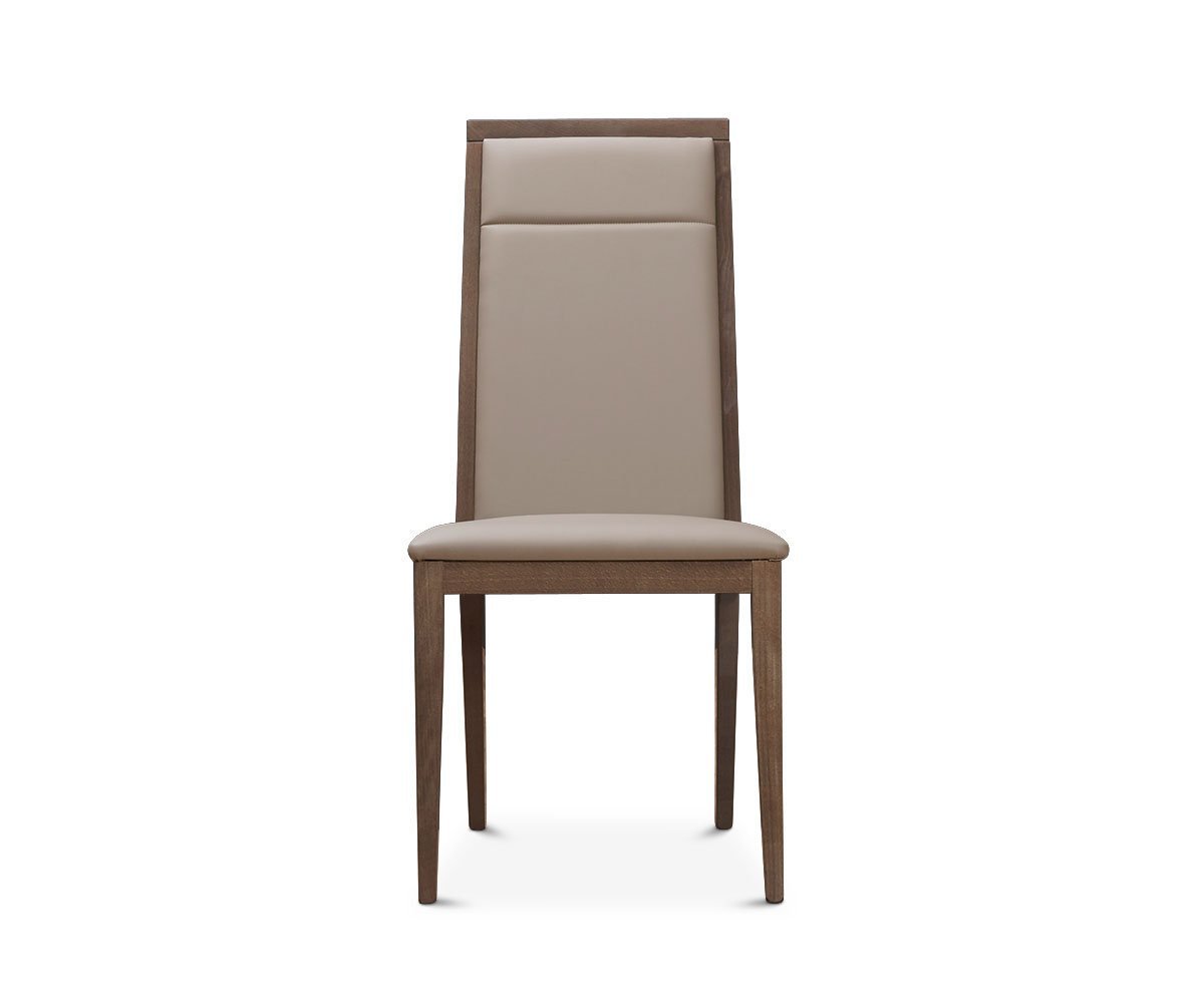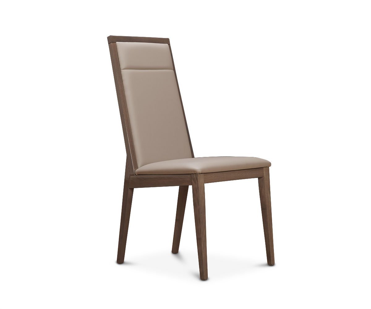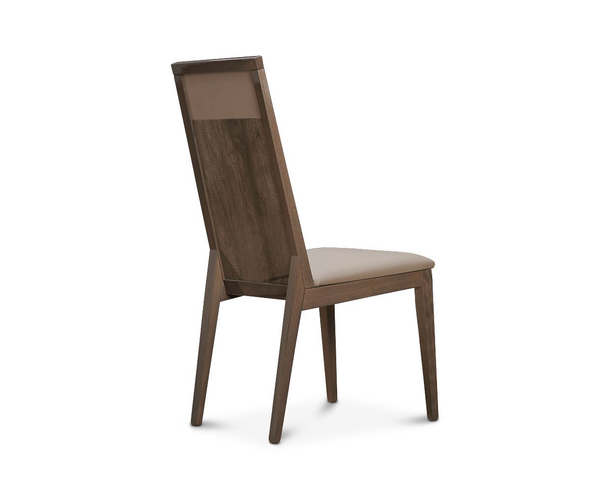 The Akana dining chair, made in Italy, is the perfect blend of sleek, contemporary design with natural rustic warmth. The brown tones and wood grain pattern shines under the high gloss finish. Sit comfortably at the table for hours and enjoy dining in style with the padded seat and back in taupe upholstery.