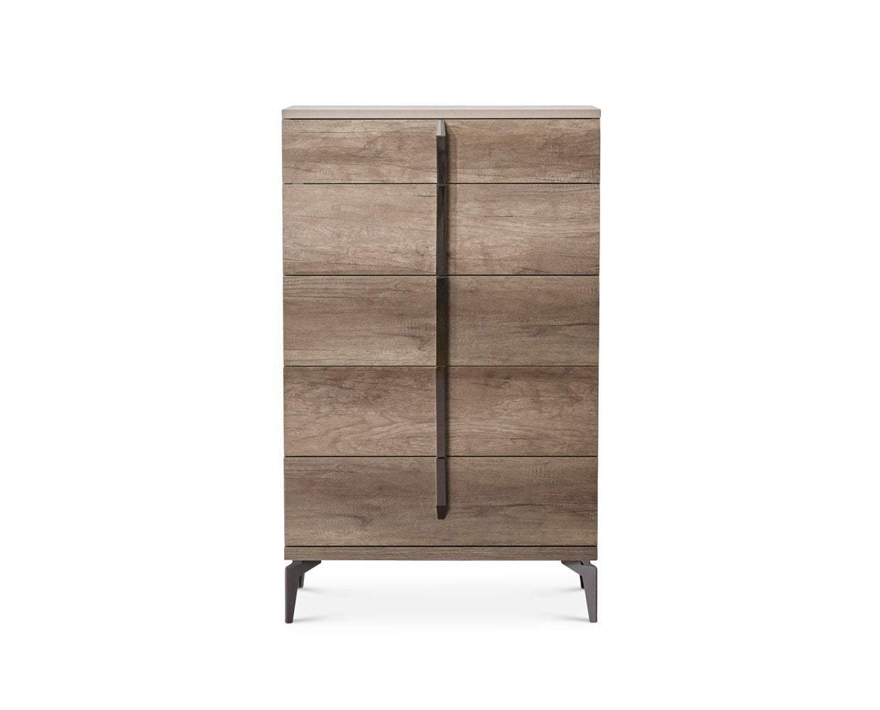 Made in Italy, the Akana high chest is a striking addition to your bedroom. Standing tall with five spacious drawers, it blends bold, modern lines with neutral tones. A handsome contrast is achieved by the slim, dark metal handles set against the wood grain pattern in a high gloss finish. This unique design is cleverly punctuated by the angled and tapered metal legs.