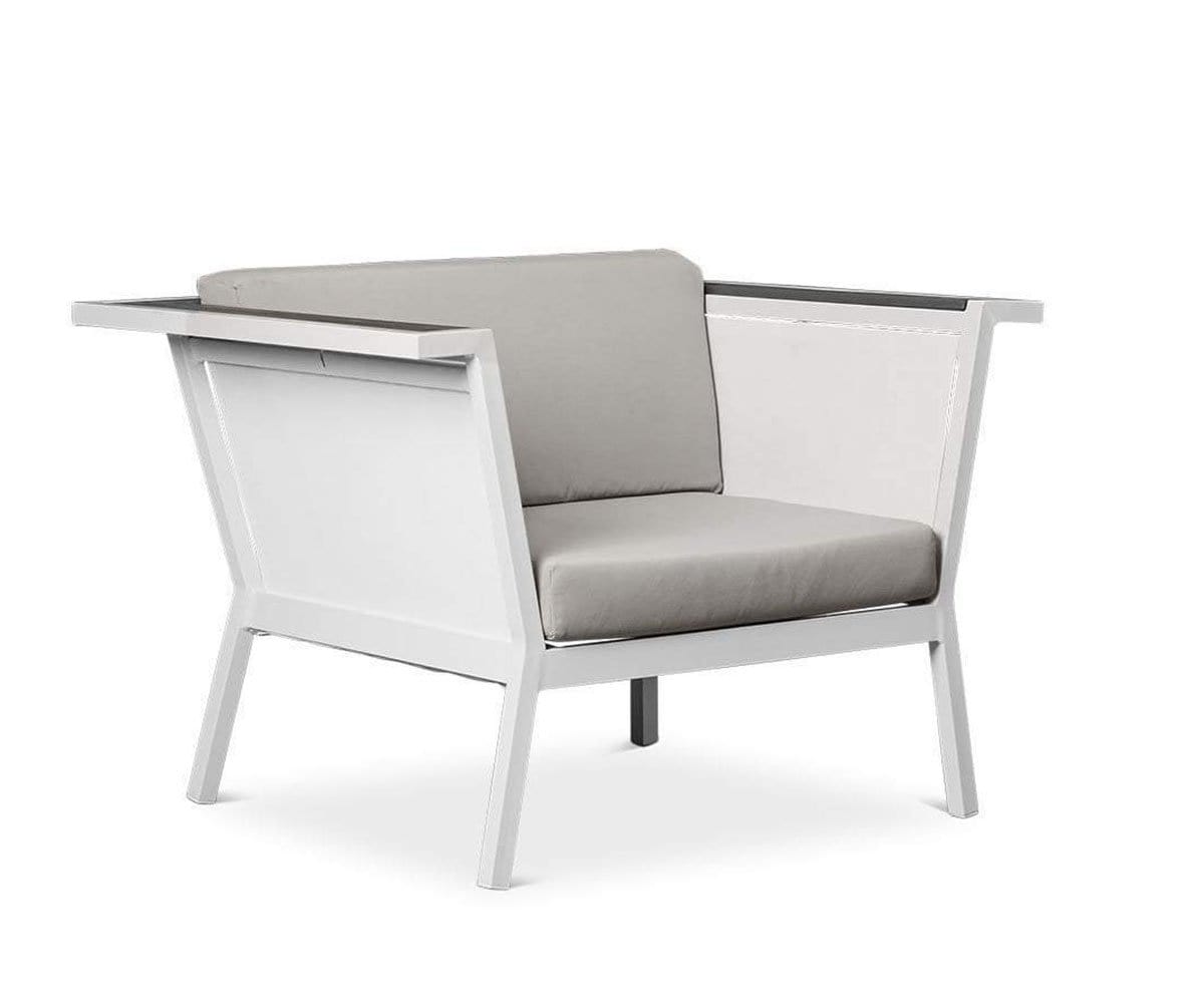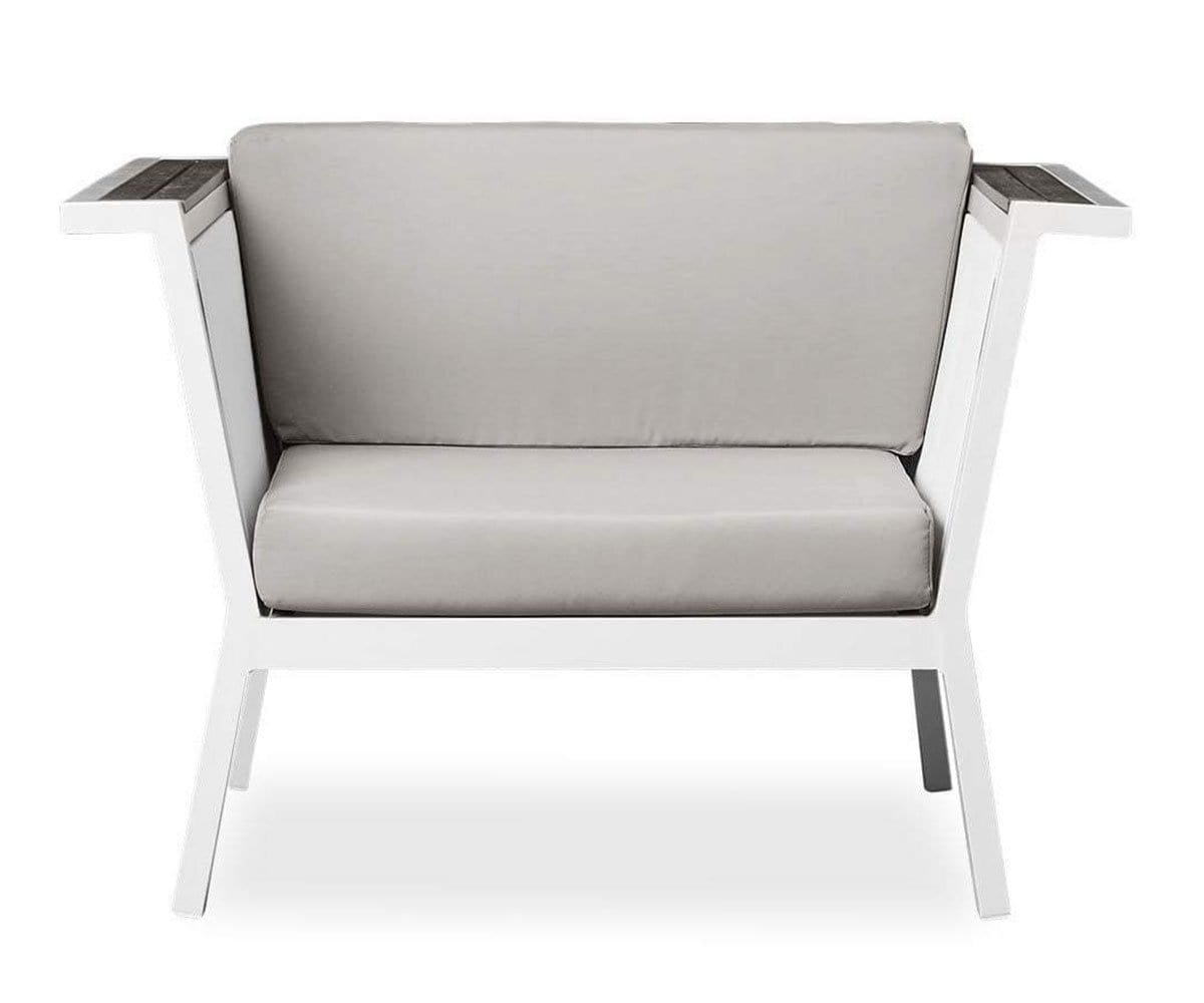 The Aurora armchair is the perfect piece to complete your outdoor seating arrangement. It has a clean, contemporary feel, thanks to the neutral shade of the powder coated frame and subtle resin-wood details. The finishing touches are the cushions, which are wrapped in grey Olefin outdoor fabric. Olefin is a high-performance material that's water-repellent, stain-resistant and mildew-resistant. It also has a powerful color fastness rating to resist fading from sun and weather exposure.