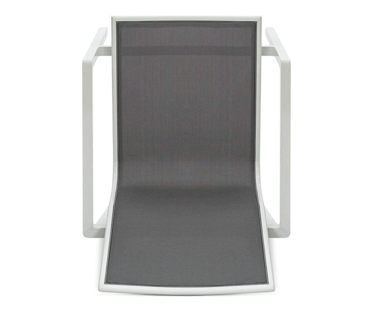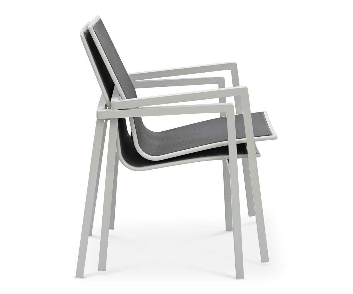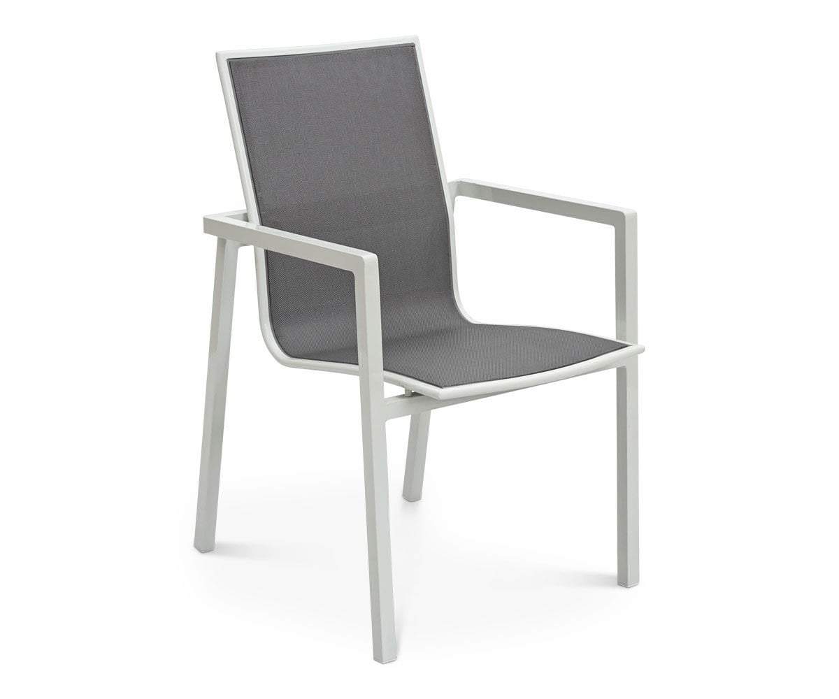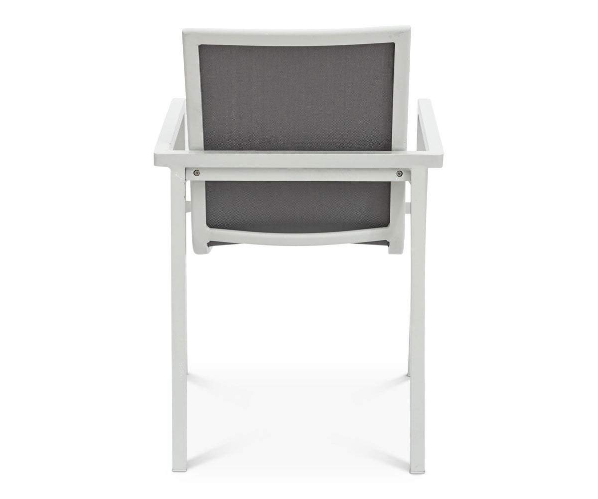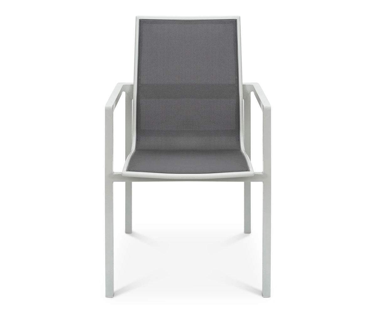 Its lightweight, modern design makes the Aurora dining chair a perfect match for many different dining tables. Crafted of a white powder-coated aluminum frame with a grey mesh fabric seat, it is versatile enough to fit in with your established decor or pair with the entire Aurora collection. Clean lines, wrap around arms and slight curves for support ensures comfort and style for outdoor entertaining.