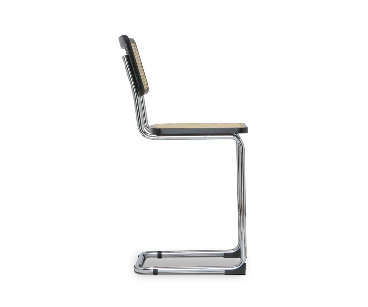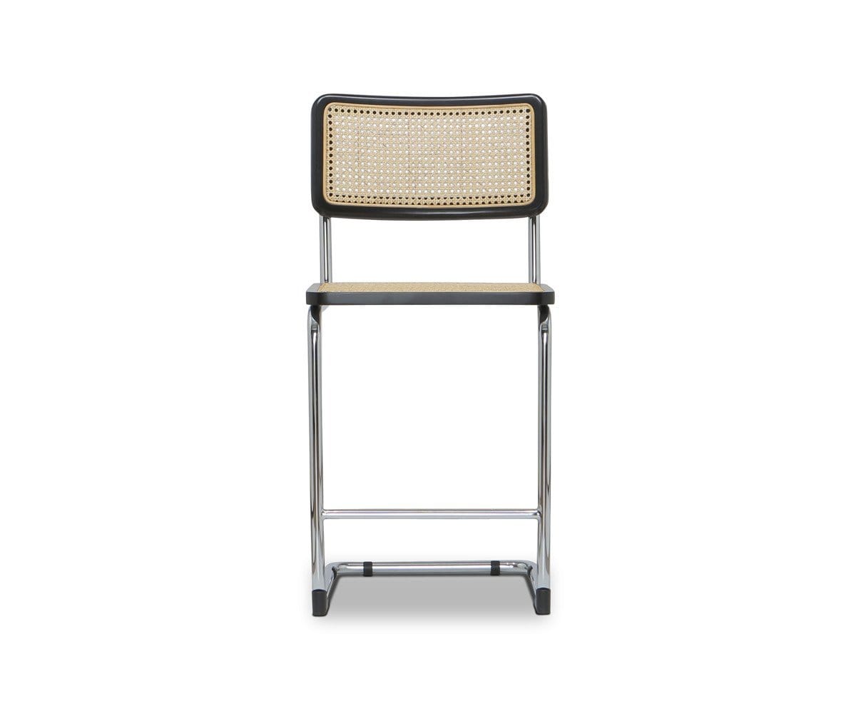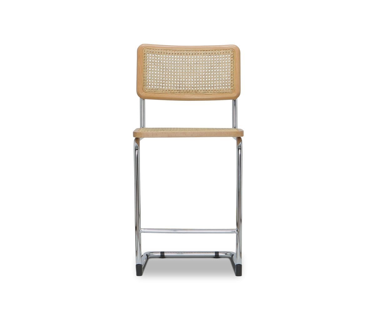 The Bendt counter stool is crafted with solid European beech that frames the cane seat and backrest. A cantilevered metal frame is finished in polished chrome for a distinctive mid-century look.