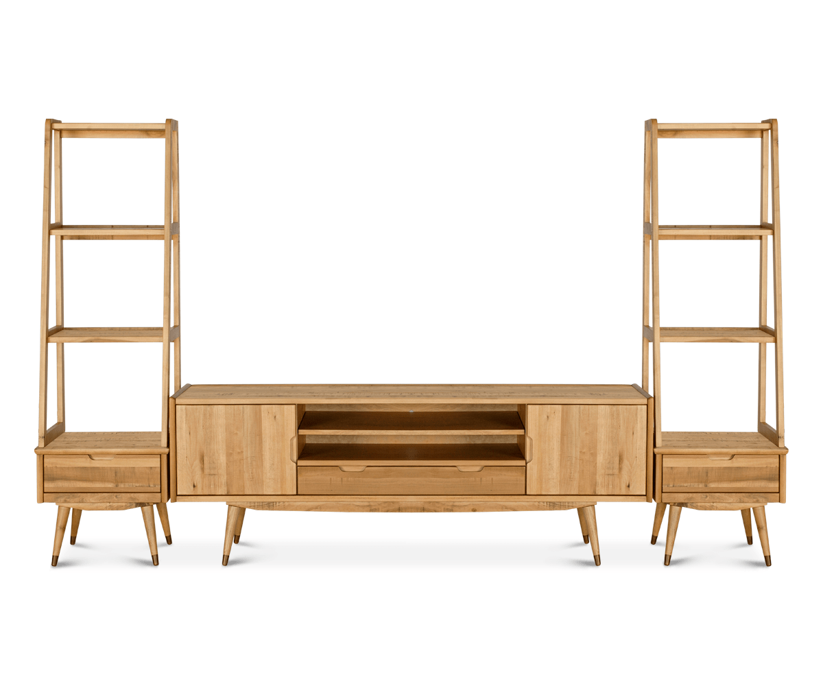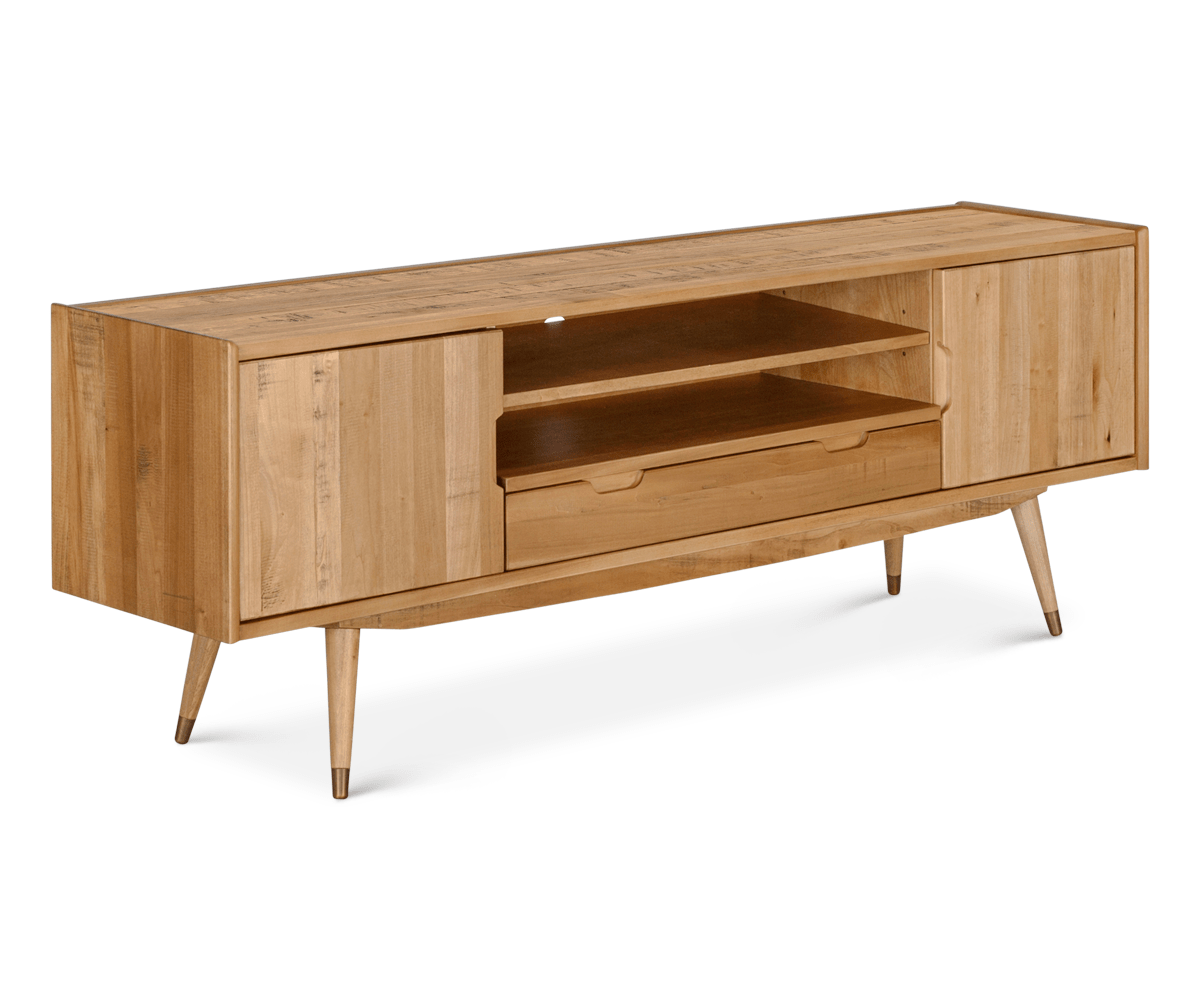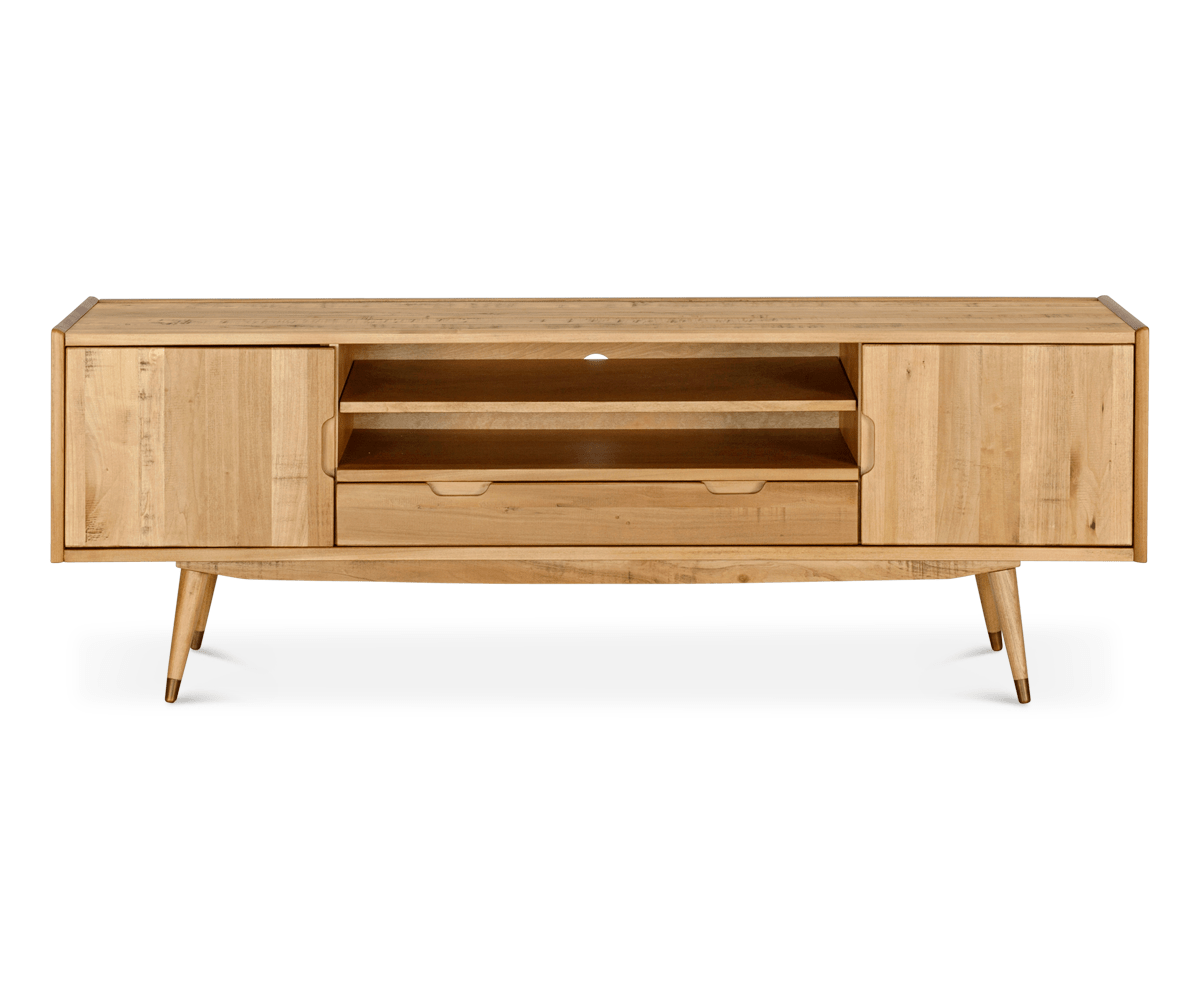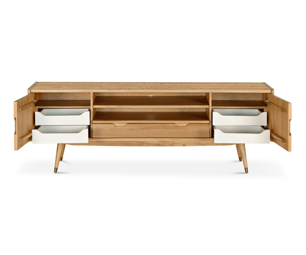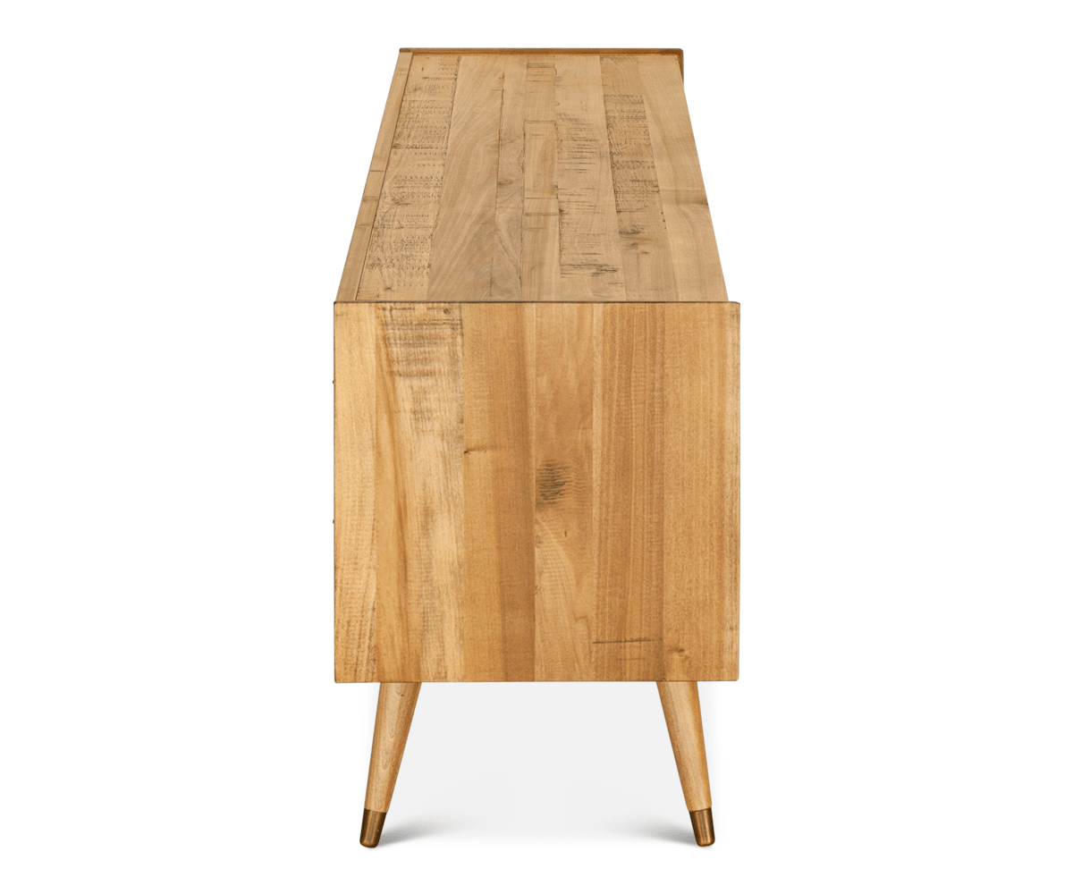 The Bolig media stand, crafted from solid American poplar with a distressed finish, is perfect for incorporating storage capability into your space without adding visual weight. The airy, open design is Scandinavian style at its best, with angled, tapered legs finished with brass capped feet. Open shelving allows easy access, while a mix of drawers, both visible and hidden, provide ample space to organize any number of items. The rustic reclaimed look of this collection is achieved through an intentional distressing technique that applies burn and saw marks to the surface while retaining and highlighting natural characteristics in the wood. This technique results in a reclaimed driftwood appearance, which adds personality and a one-of-a-kind uniqueness to each piece.