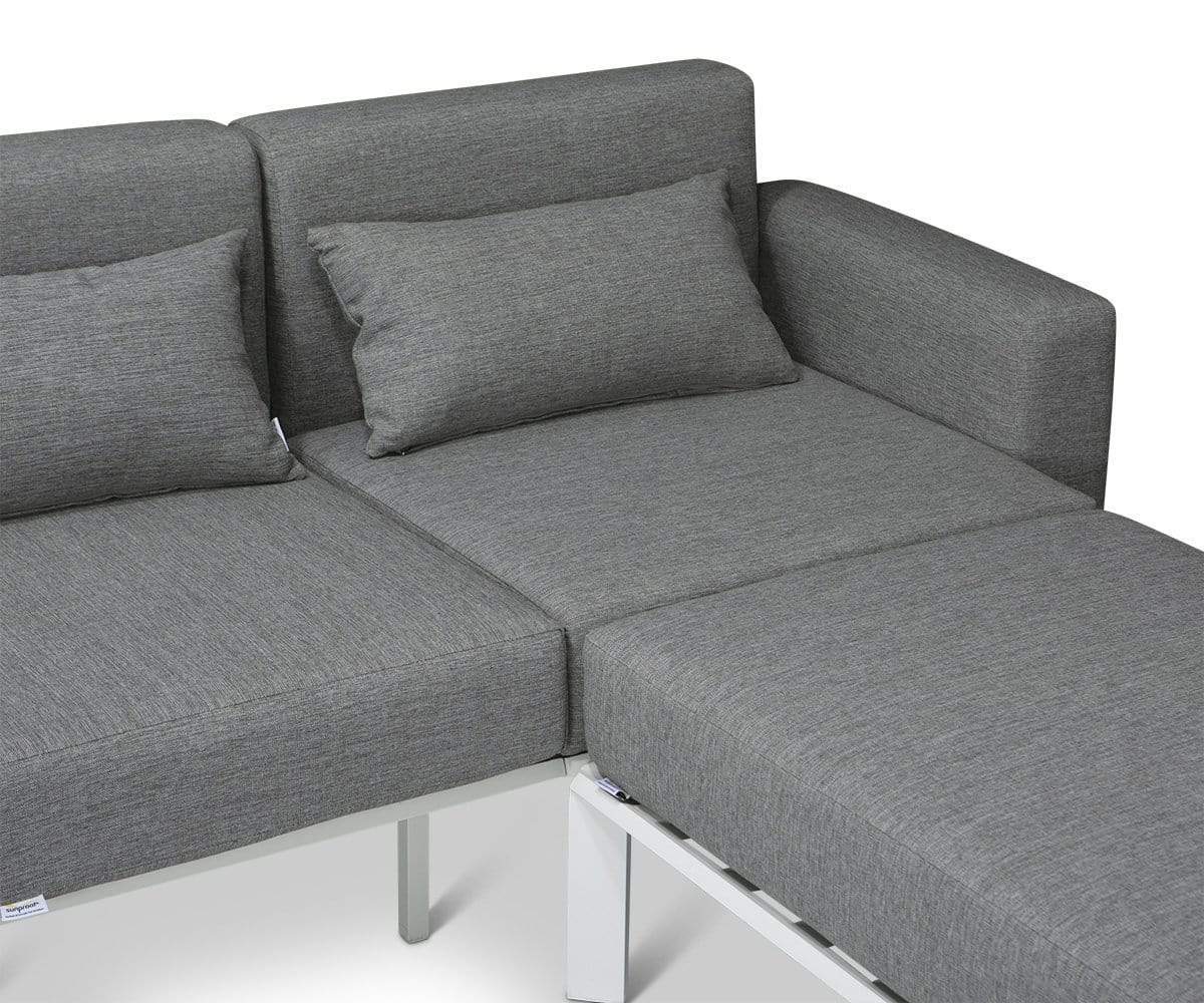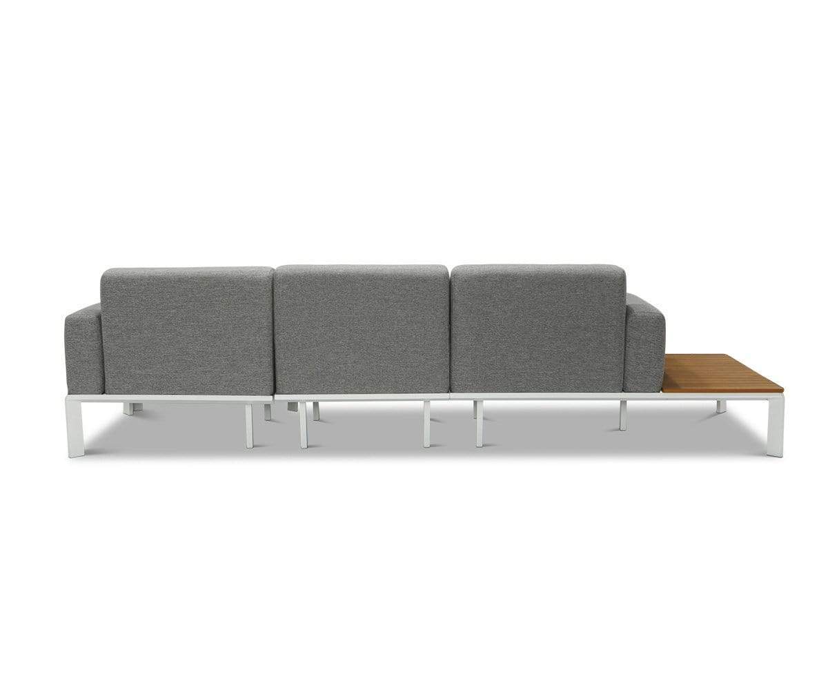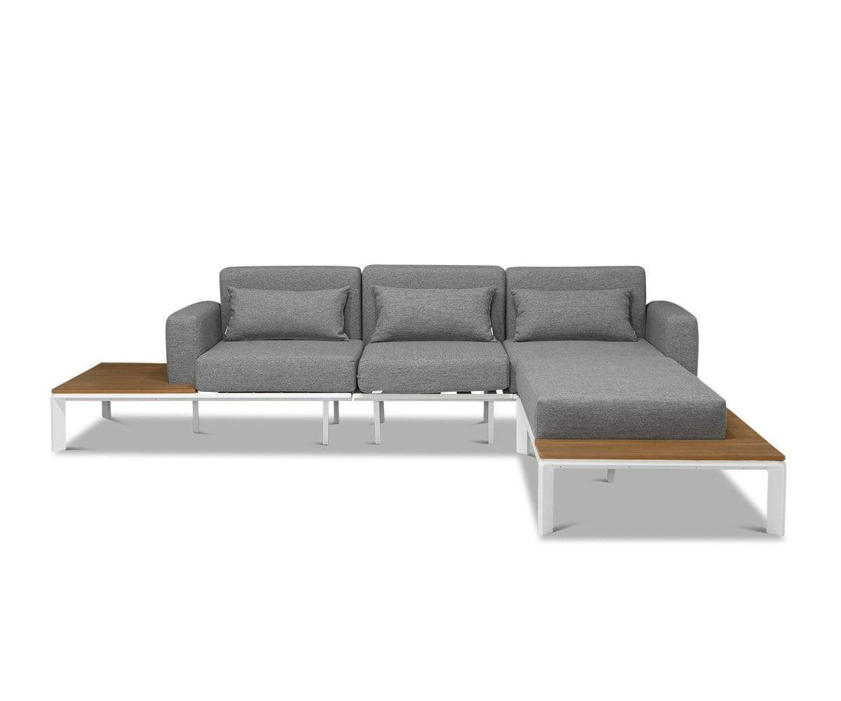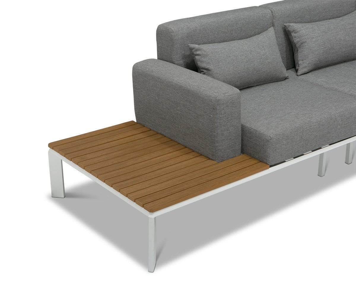 This intricately designed piece has a contemporary coastal look that makes it feel like you're on an island getaway the moment you step outside. Yes, the Capitola sectional is that transformative! The white powder coated aluminum frame accentuates the gorgeous, faux-teak slats. And the cushions are wrapped in premium Olefin outdoor fabric, which has a color fastness rating of 7-8 for powerful fade-resistant performance. Olefin is also water-repellent, stain-resistant and mildew-resistant—literally, every base is covered.