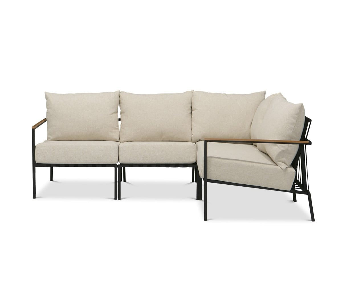 This is outdoor R & R at its finest. With the Da Costa sectional, you're getting a mix of performance, comfort and style you won't find elsewhere. The black powder coated metal frame contrasts with the beige cushions and faux-teak arm details for a resort-worthy look. The cushions are wrapped in Olefin outdoor fabric, which features a color fastness rating of 7-8 for powerful fade-resistant performance. It's also water-repellent, stain-resistant and mildew-resistant. Pair with other pieces in the Da Costa collection to turn your outdoor area into a relaxing oasis.