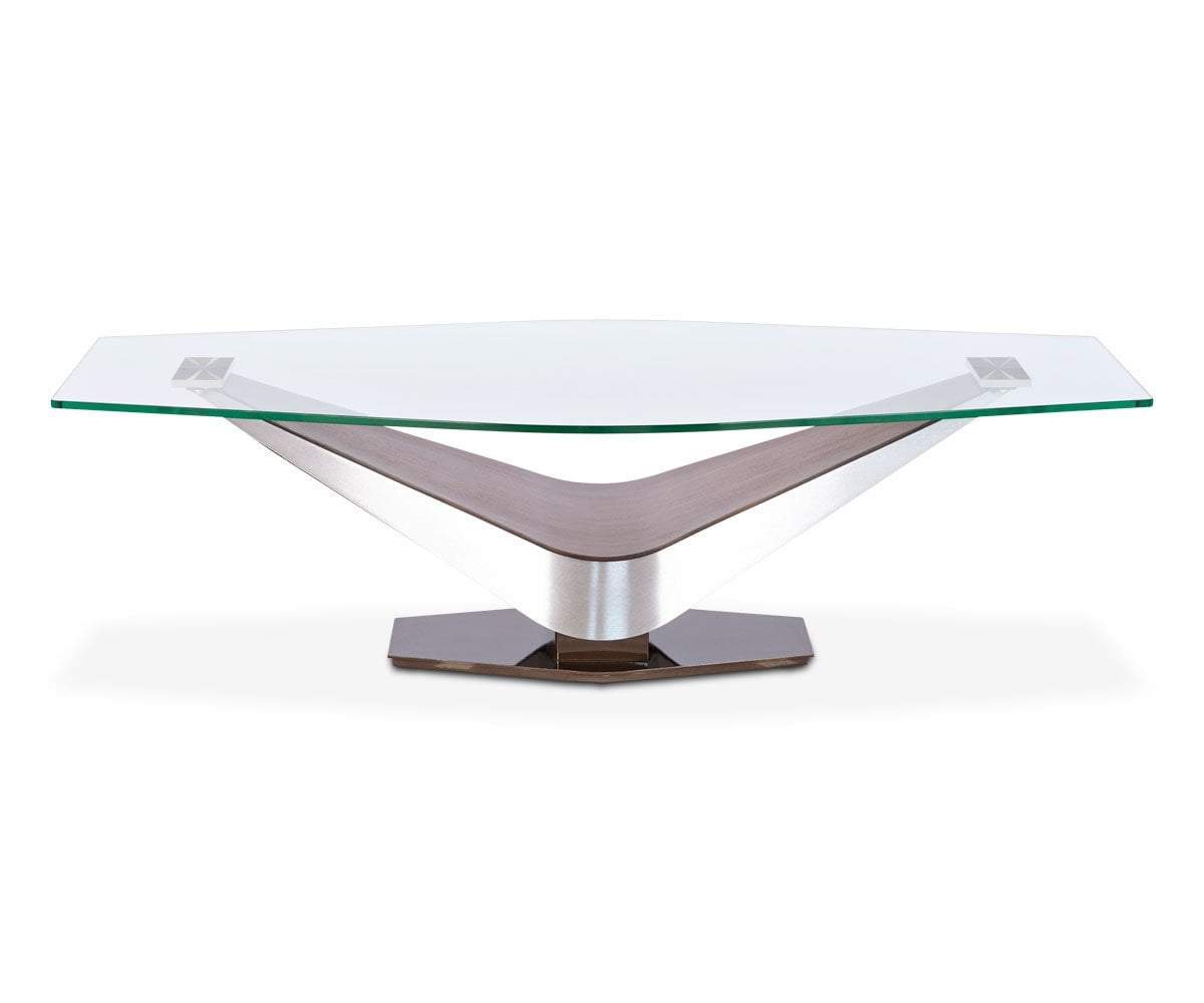 Vying to be the center of the room, the Dermae coffee table commands attention. Features a gracefully arched base crafted from brushed stainless steel with a walnut inlay supporting a shaped glass top.