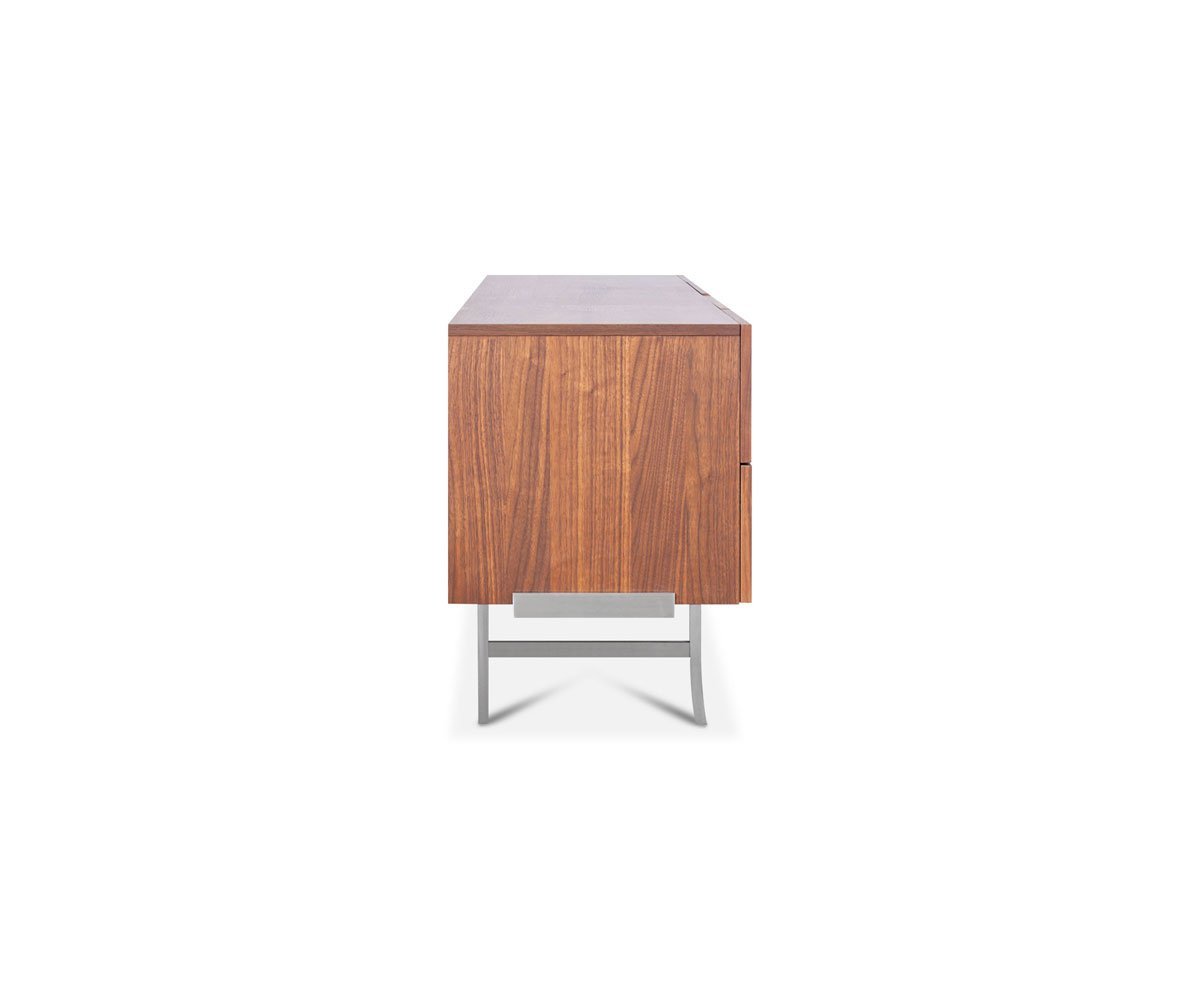 The Dissone media stand makes the ultimate entertainment organizer. This rustic industrial piece is crafted from poplar wood and brushed stainless steel. The dynamic design boasts four large drawers with smooth-glide tracks and two open cabinets.