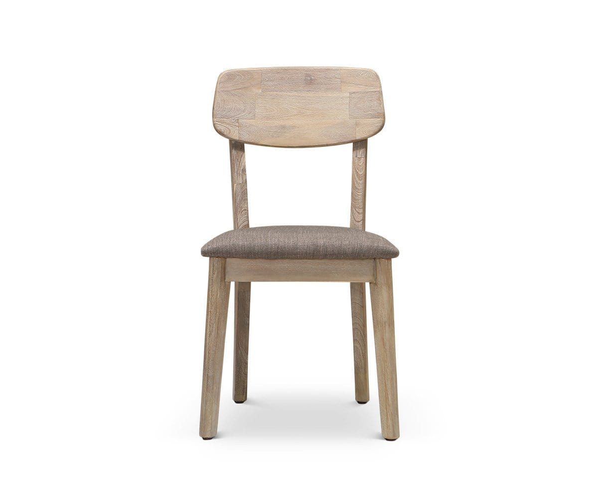The Eckler dining chair offers a classic shape and comfortable build. Made from solid acacia, it is finished in a light grey stain to highlight the swirling wood grain. The curved backrest and cushioned, upholstered seat add a surprising level of comfort to mealtime.