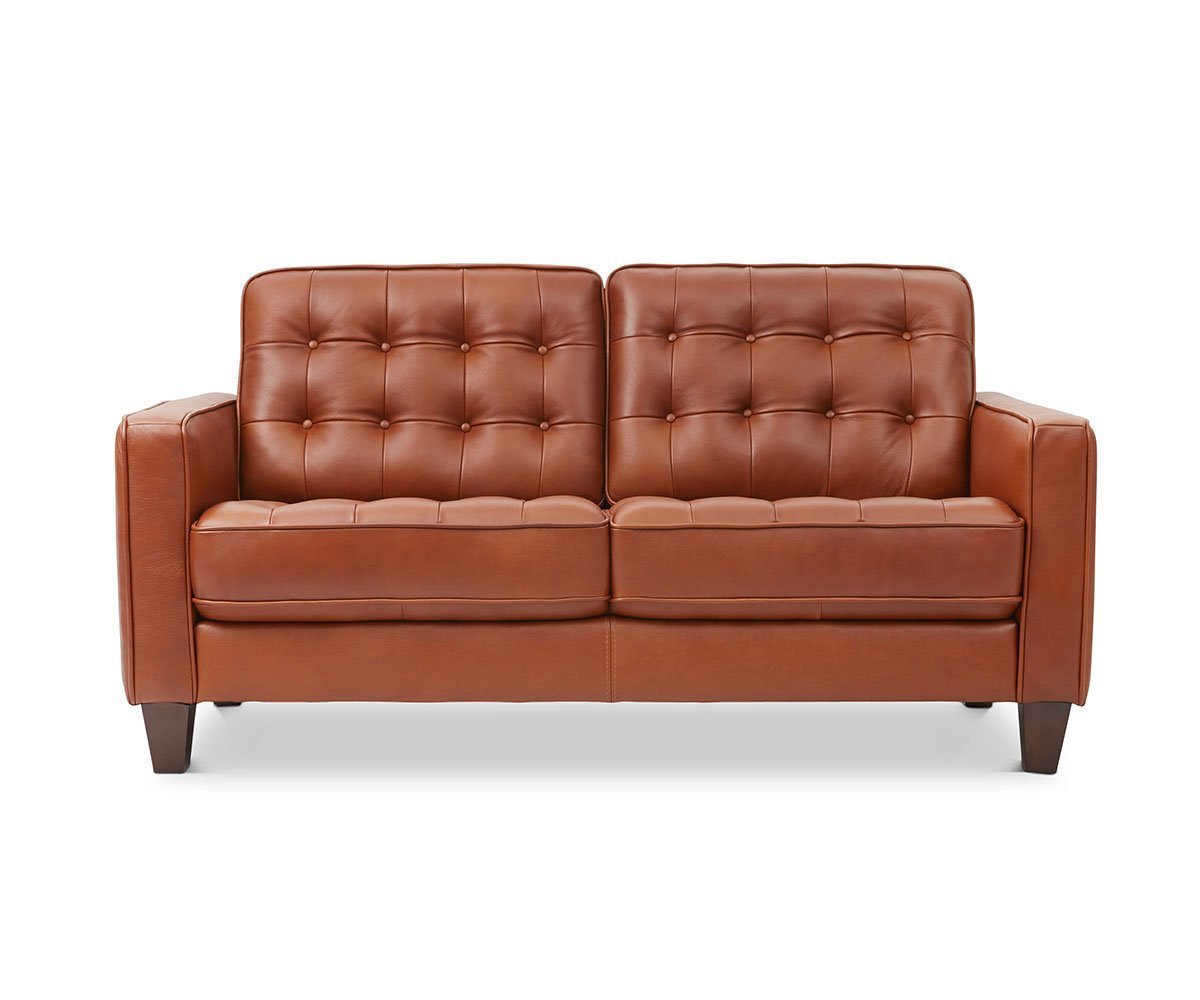 Ensure a rich, warm atmosphere in your living room with the Gustav leather loveseat. Its modern silhouette, low-profile and button tufting detail create an eye-catching aesthetic, while also providing ample comfort. Leather upholstery of the highest grade showcases the natural markings of the hide that enhance over time and make each piece truly a one-of-a-kind.