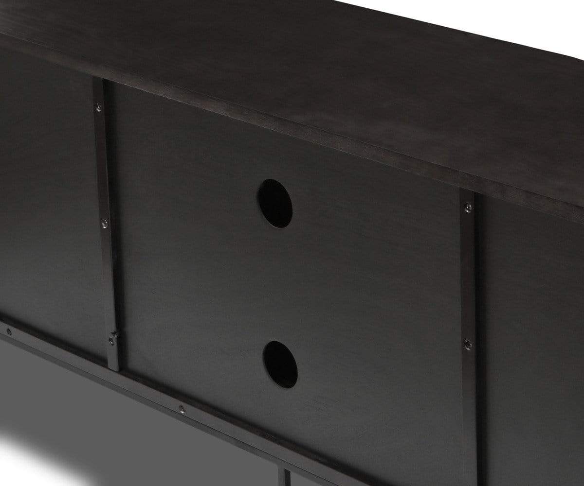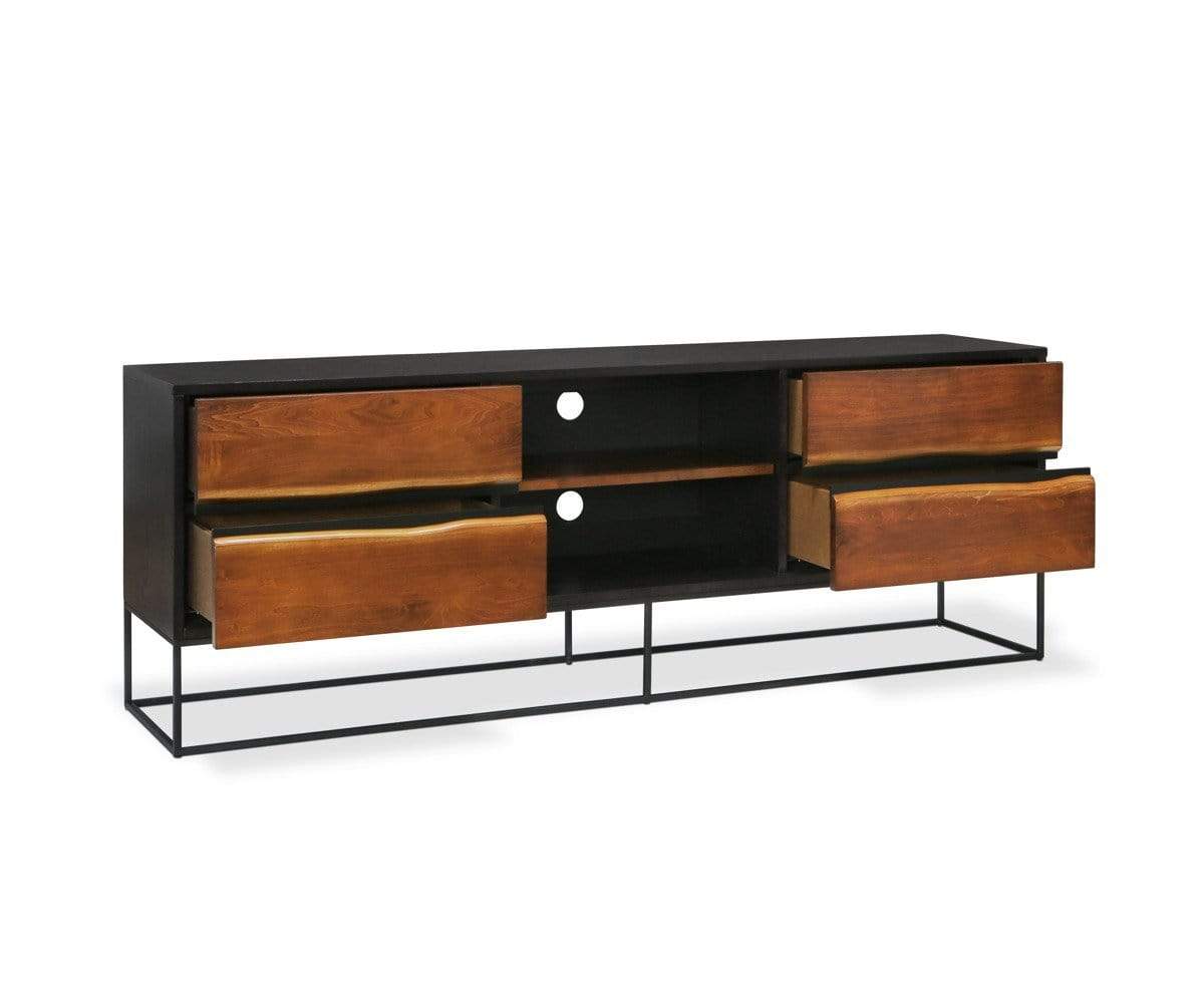 Update your entertainment area with the Hasse media stand. This modern, rustic industrial stand is crafted with a metal base and solid American poplar frame and drawers. The frame is finished in black to match the base. Two open shelves in the center set off the woodgrain of the drawers on either side.