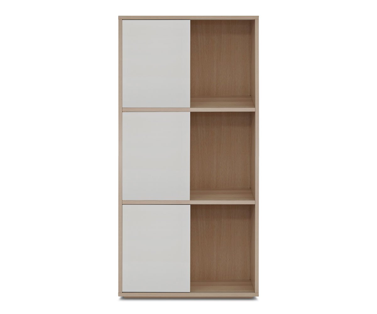 Tall, sleek and mod the Hayden bookcase can change its look with ease. Six storage cubbies become hidden or exposed as you slide the three white doors from side to side. This substantial piece crafted in Italy, complements many different decor themes with its light neutral color palette. Choose objects to display, yet easily access anything you store out of sight.