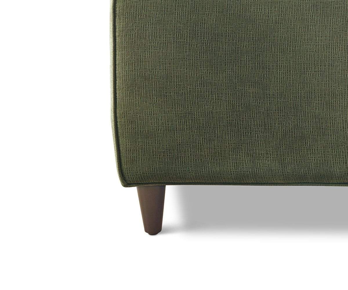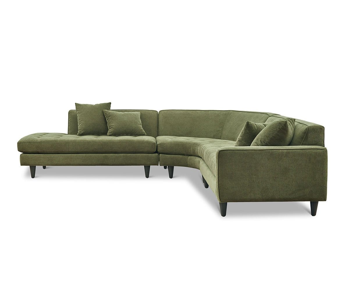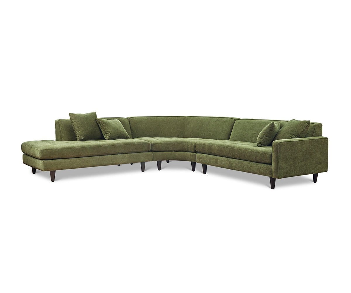 Polished and chic, the hallmark details of the Ingrid sectional include plush upholstery that wraps the tufted seat with a tightly tailored back and a curved wedge corner which enhances the sleek and modern look. Its graceful style is accented by tapered wooden legs and finished with four matching toss pillows in two sizes. Made in the USA.