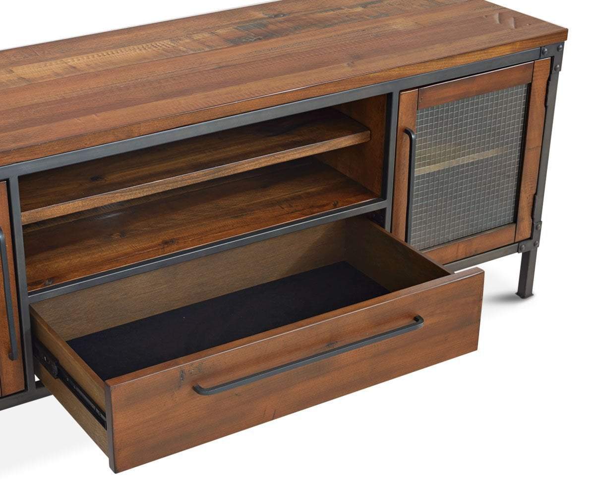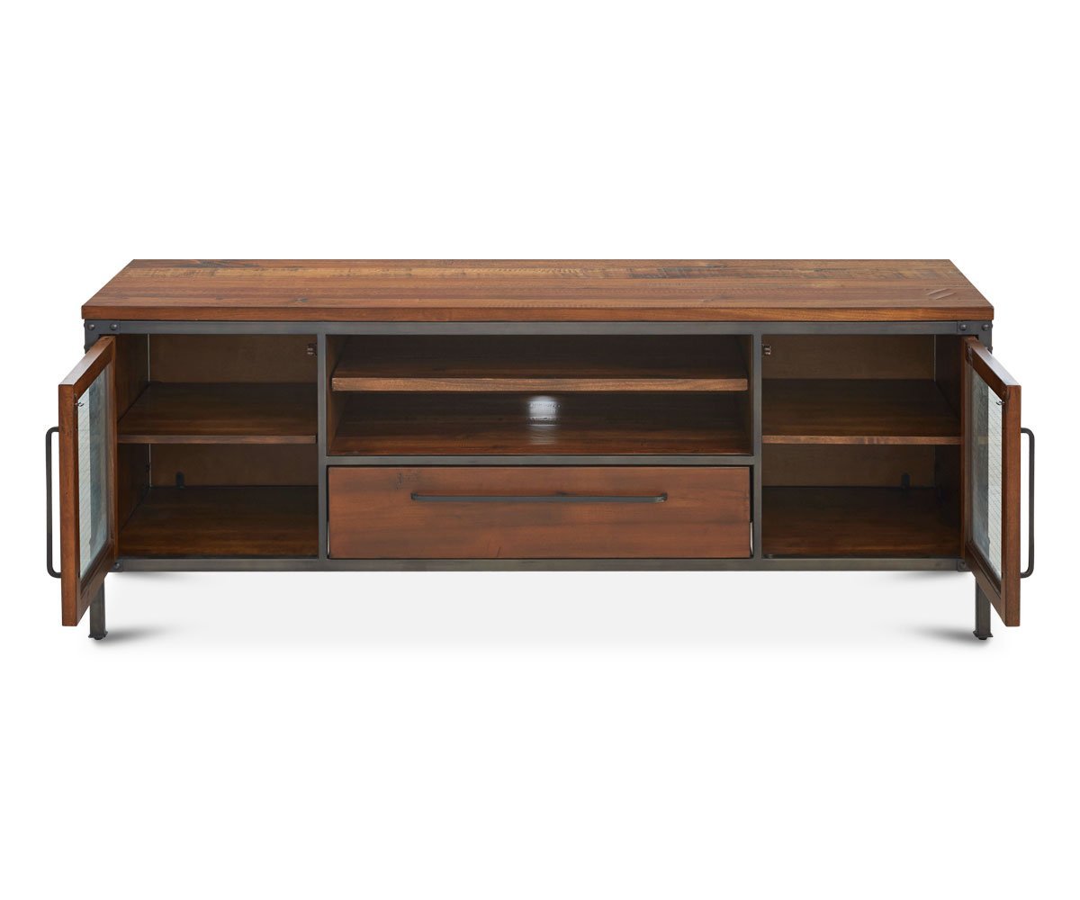 Update your home entertainment area with the Insigna media stand. The mix of rustic and industrial elements offer high style as well as ample storage space with open shelves, one felt-lined drawer and two wire-front cabinets.
