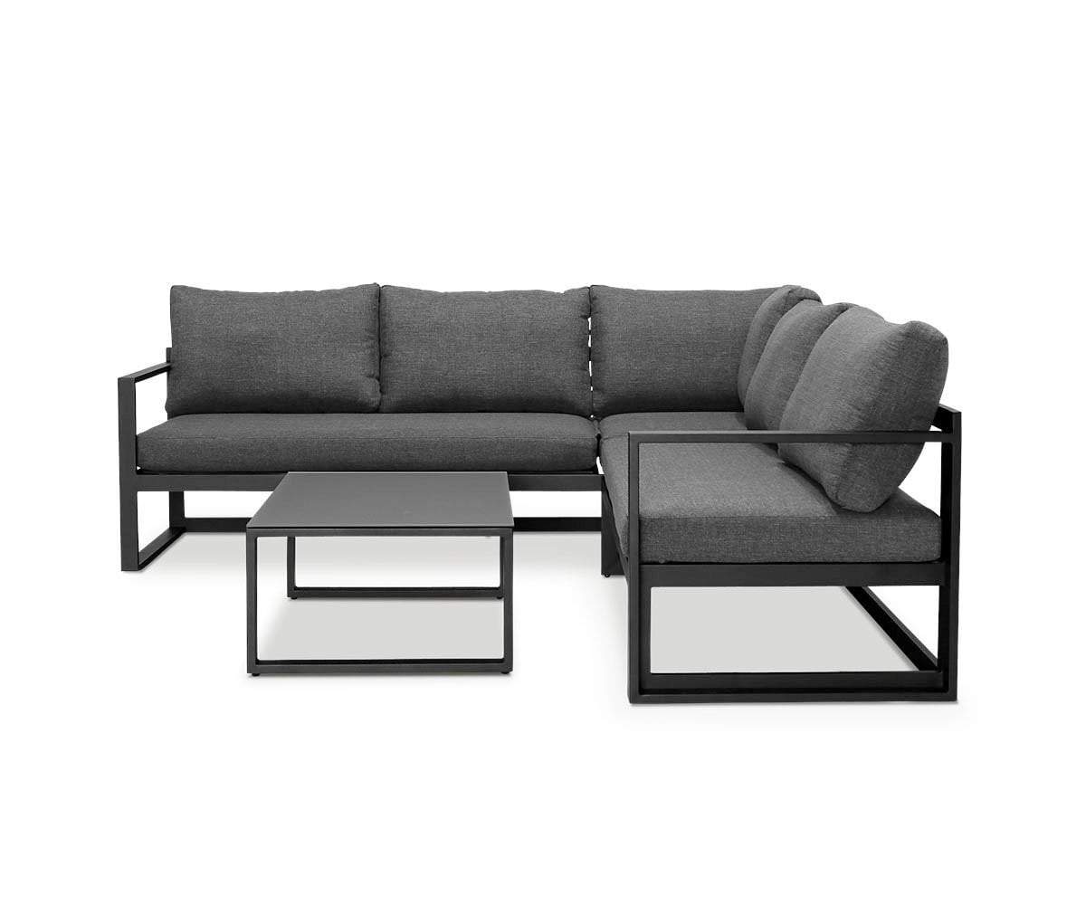 The Jaren sectional with coffee table is comfortable, contemporary and to-the-point with its clean lines. The open, airy frame features dynamic 90-degree angles and is made with aluminum that has been treated for all-weather durability. The sleek coffee table is made with a tempered and tinted glass top. Plush cushions are enveloped with water-repellent and UV-resistant covers for long-lasting beauty and minimal maintenance.