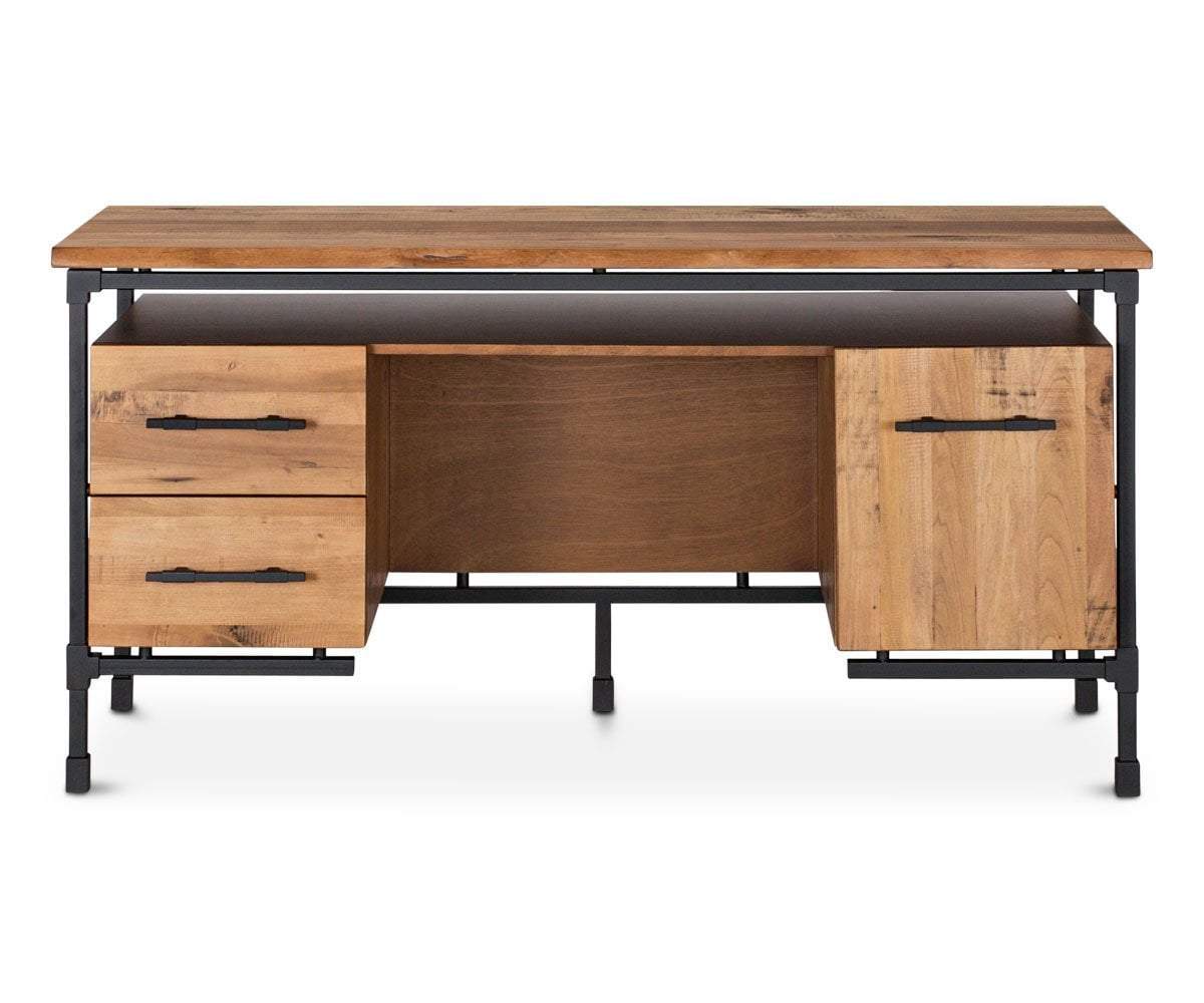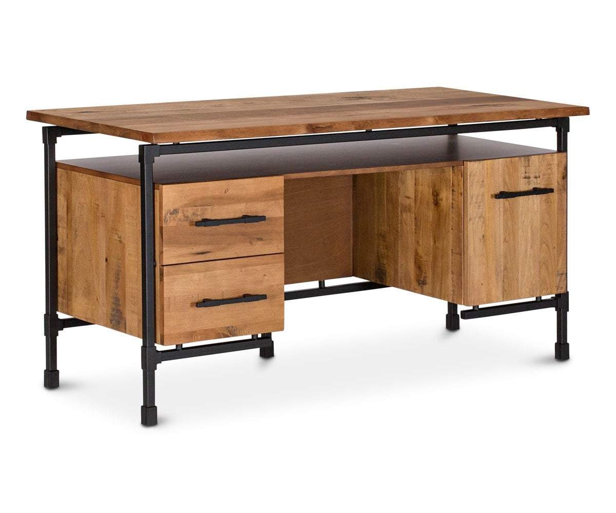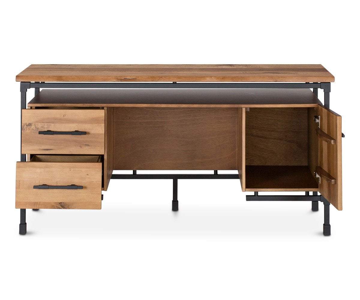The Karsten desk is a ruggedly handsome addition to your office. Welded metal is formed into an industrial style frame which supports the solid American poplar desktop in warm, earthy tones. Resting below, is the base consisting of two drawers and cabinet storage. Let inspiration flow when you take a seat at this fully functional, beautifully designed rustic modern solution for your work space.