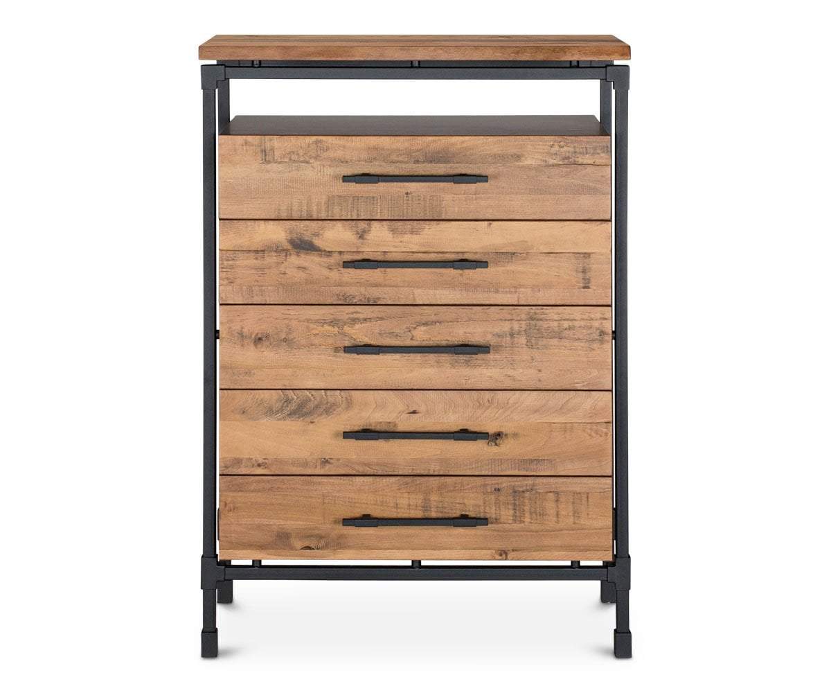 The Karsten high chest knows that floor space is valuable, which is why it is built up and not out. This vertical design boasts five large drawers to store your clothes and accessories. Crafted from solid American poplar wood with a powder-coated metal frame.