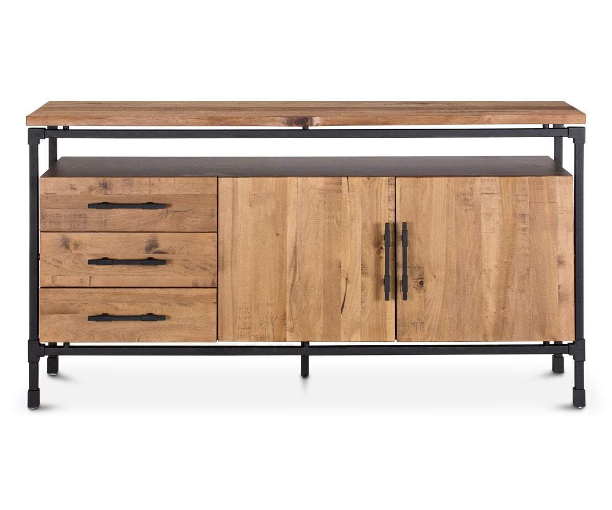 Complete your rustic industrial dining room decor with the Karsten sideboard. Rugged powder-coated metal is welded into an interlocking frame with clean lines and supports the solid American poplar top, ideal for buffet-style dining or decorative displays. The separate base unit below boasts three large drawers and a double door cabinet with an adjustable shelf, perfect for storing away extra place settings, silverware or linens.