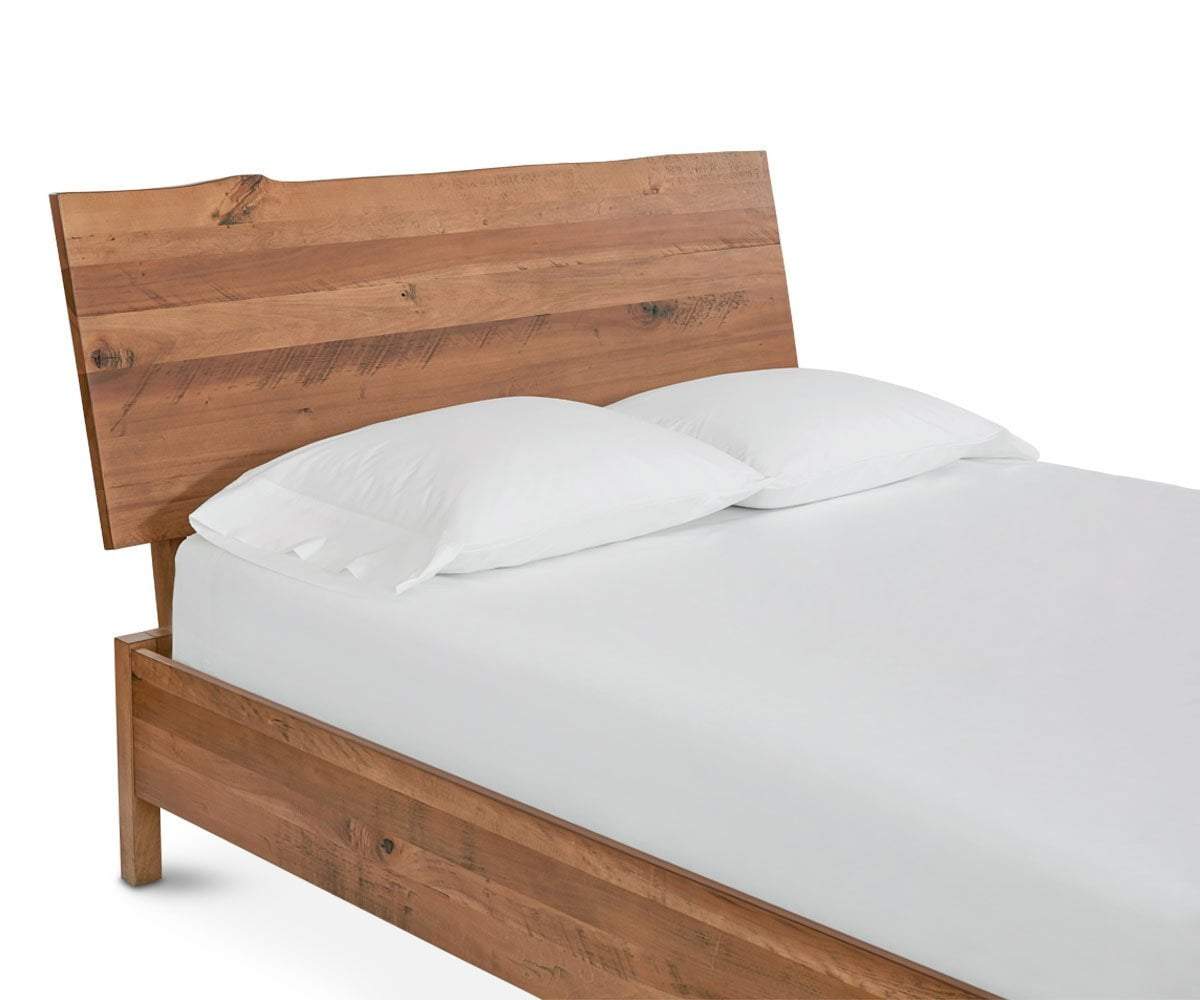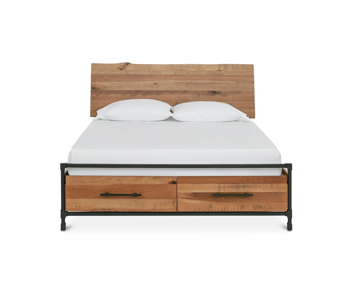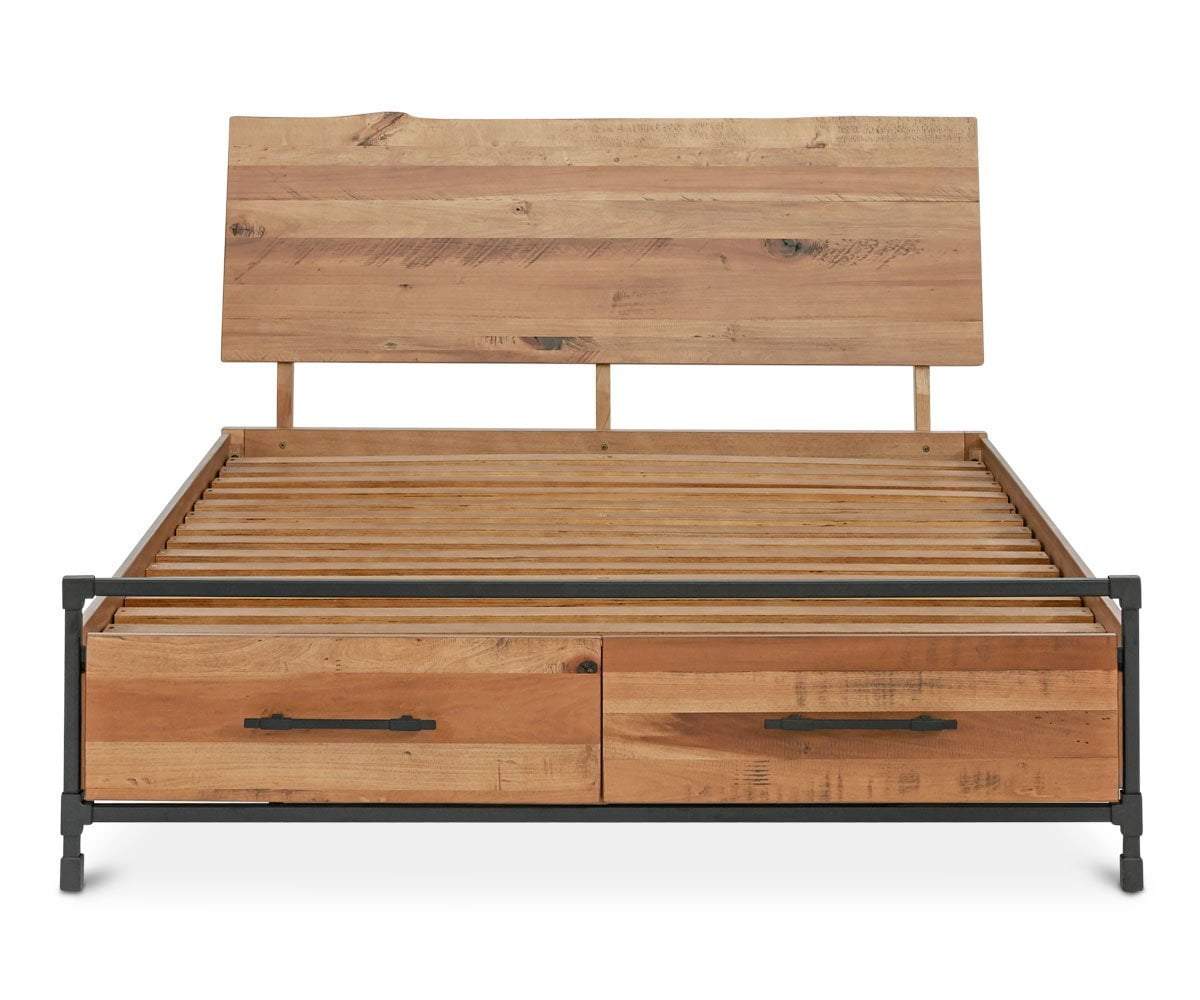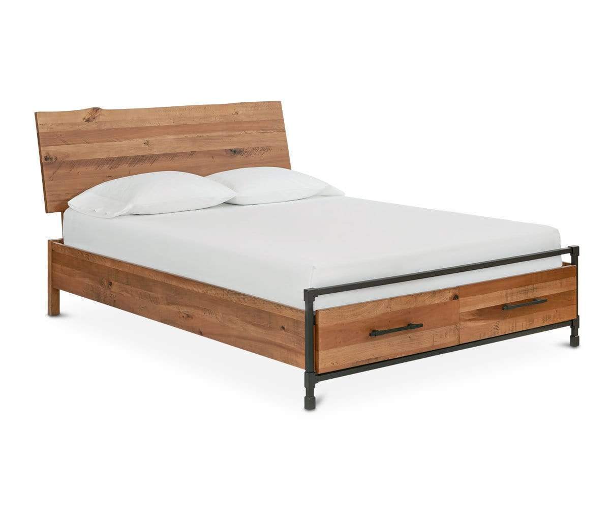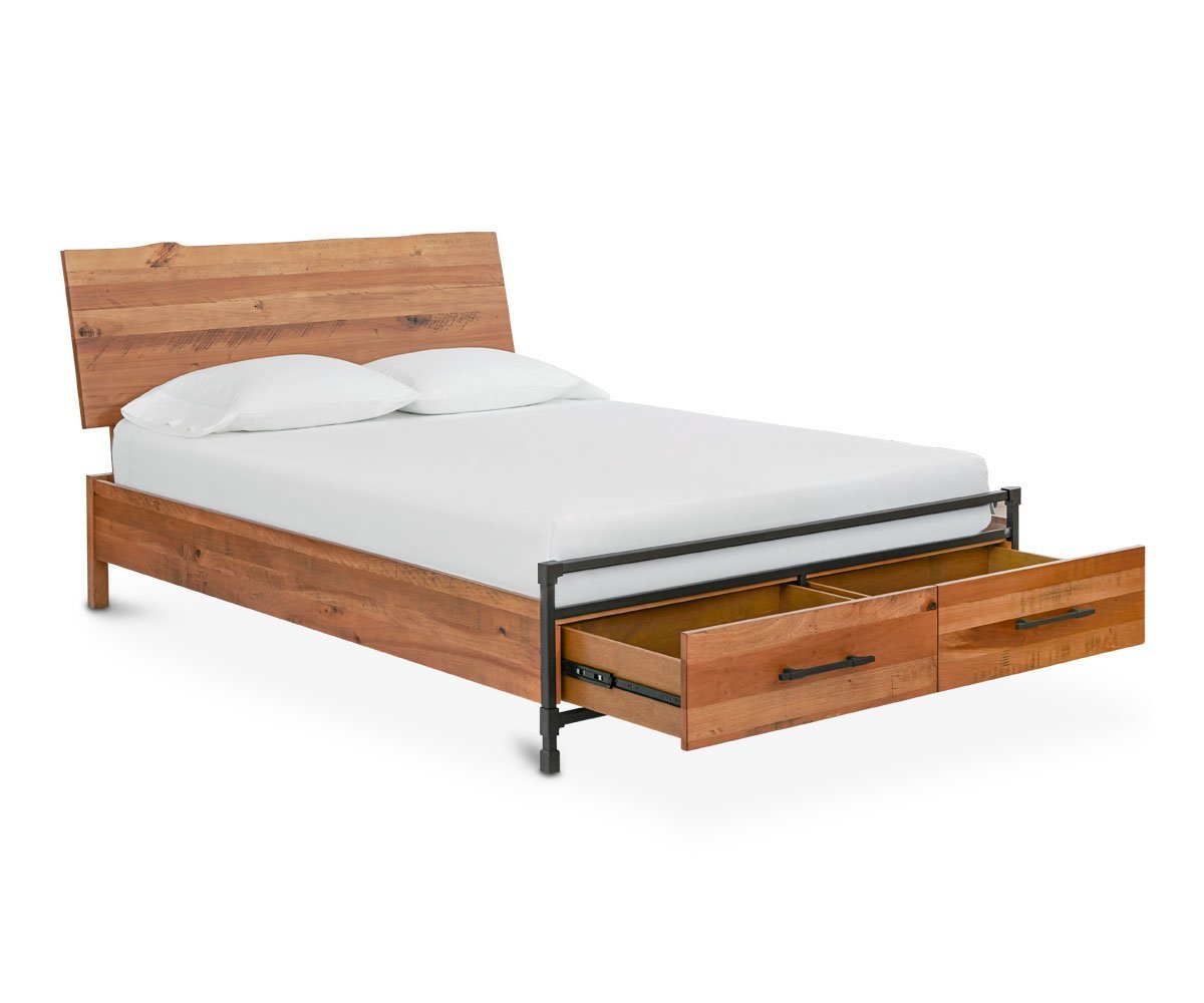 The rustic industrial Karsten platform bed offers a sleek headboard and two large storage drawers crafted from solid American poplar wood. The frame and footboard are made of powder-coated metal for dramatic contrast.