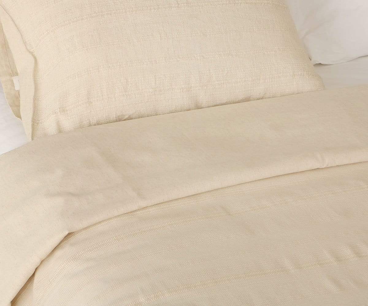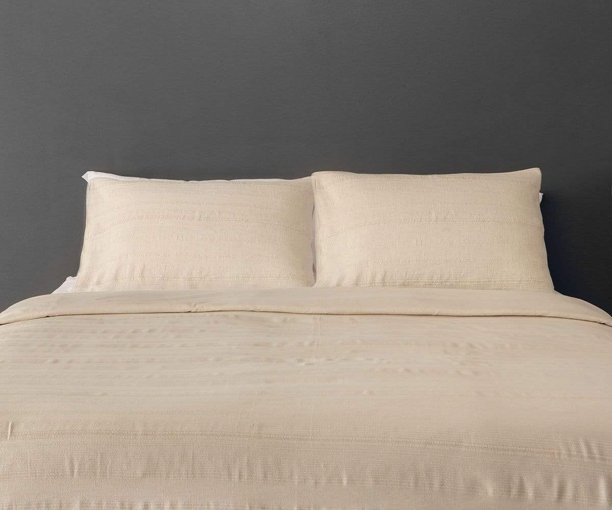 In an earthy neutral beige hue, the Kjenn duvet set is ideal for creating a harmonious bedroom. The elegant design is made from cotton, flax, and linen for softness and strength. The set includes a duvet cover and two pillow shams.