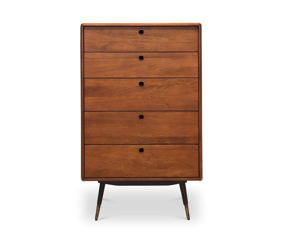 We’re swooning for everything in the Lanson collection, and the high chest is no exception. The solid poplar’s fine grain is underscored by a rich, robust walnut stain, while brass pulls highlight five drawers. To top it off, we added angled, brass-capped legs for a subtle mid-century feel.