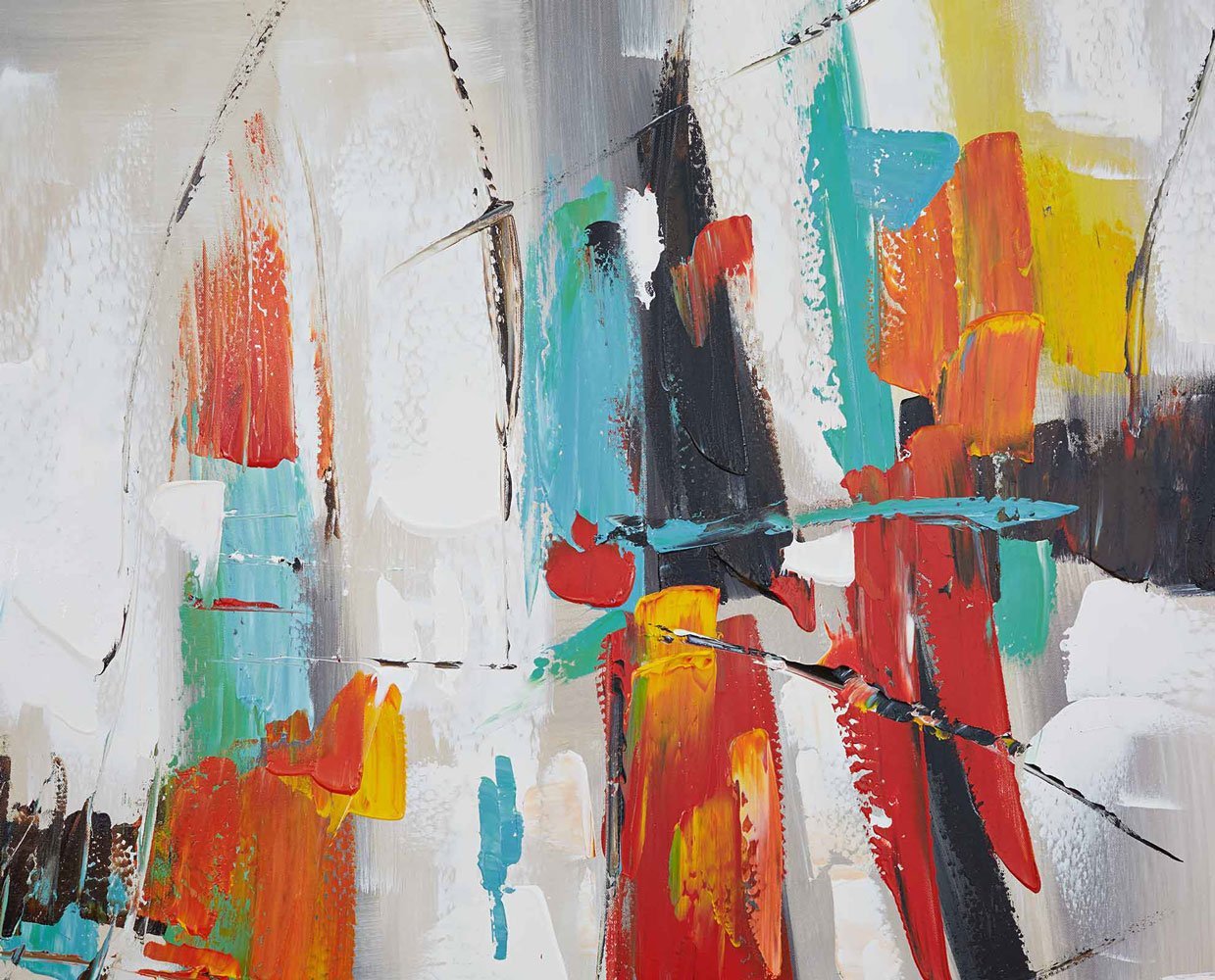 With vivid hues boldly applied, the Lively abstract seems to celebrate life itself. The brilliant splashes of acrylic paint on this canvas arouse joy, stir the imagination and appeal to all ages. Framed in black, this striking work of art is set enliven any setting.
