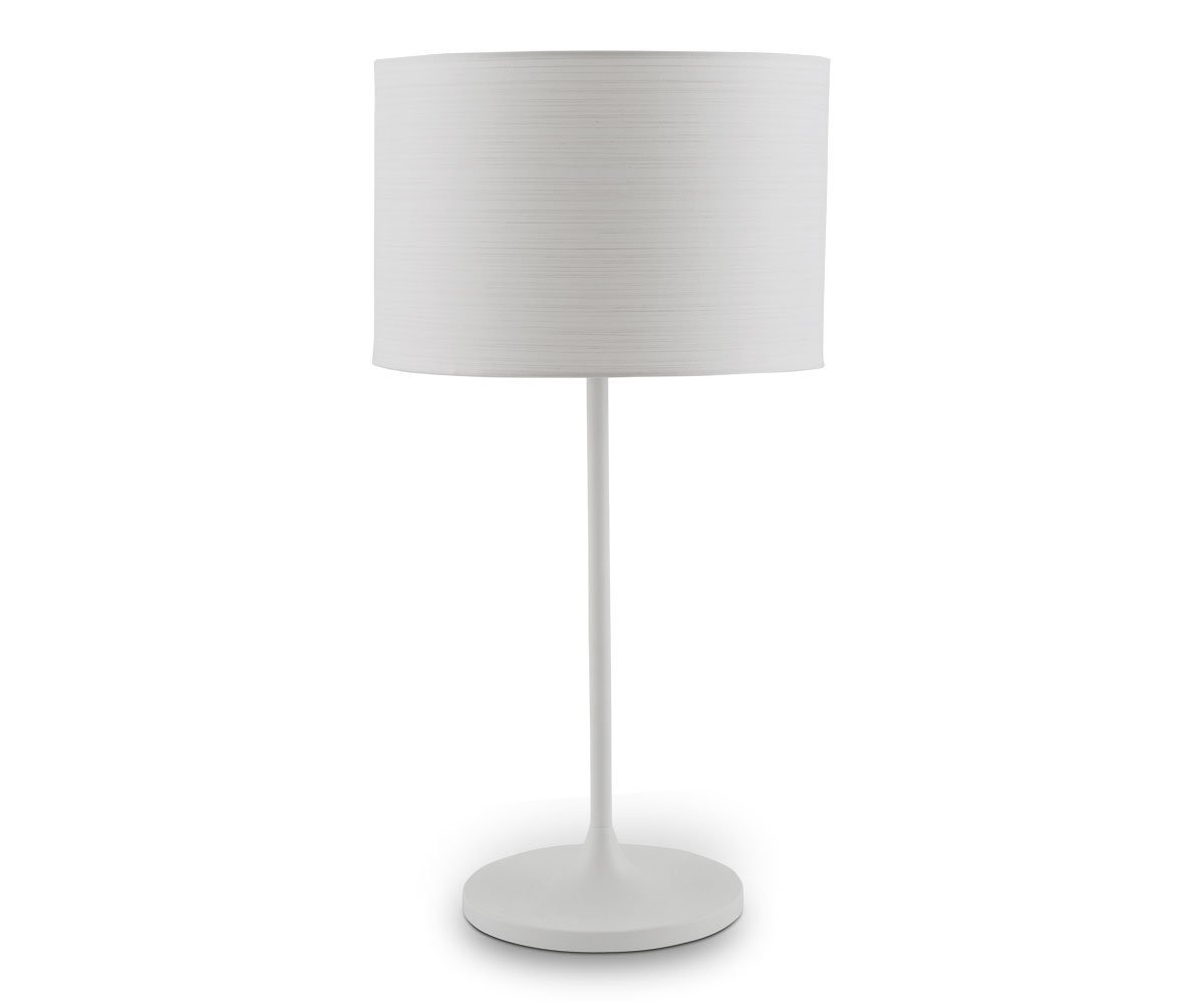 The slender profile of the Maddalena table lamp lends an elegant touch to any tabletop. The barrel-shaped Japanese paper shade provides a soft glow atop a slender stem transitioning from a wide base in matte white painted steel.