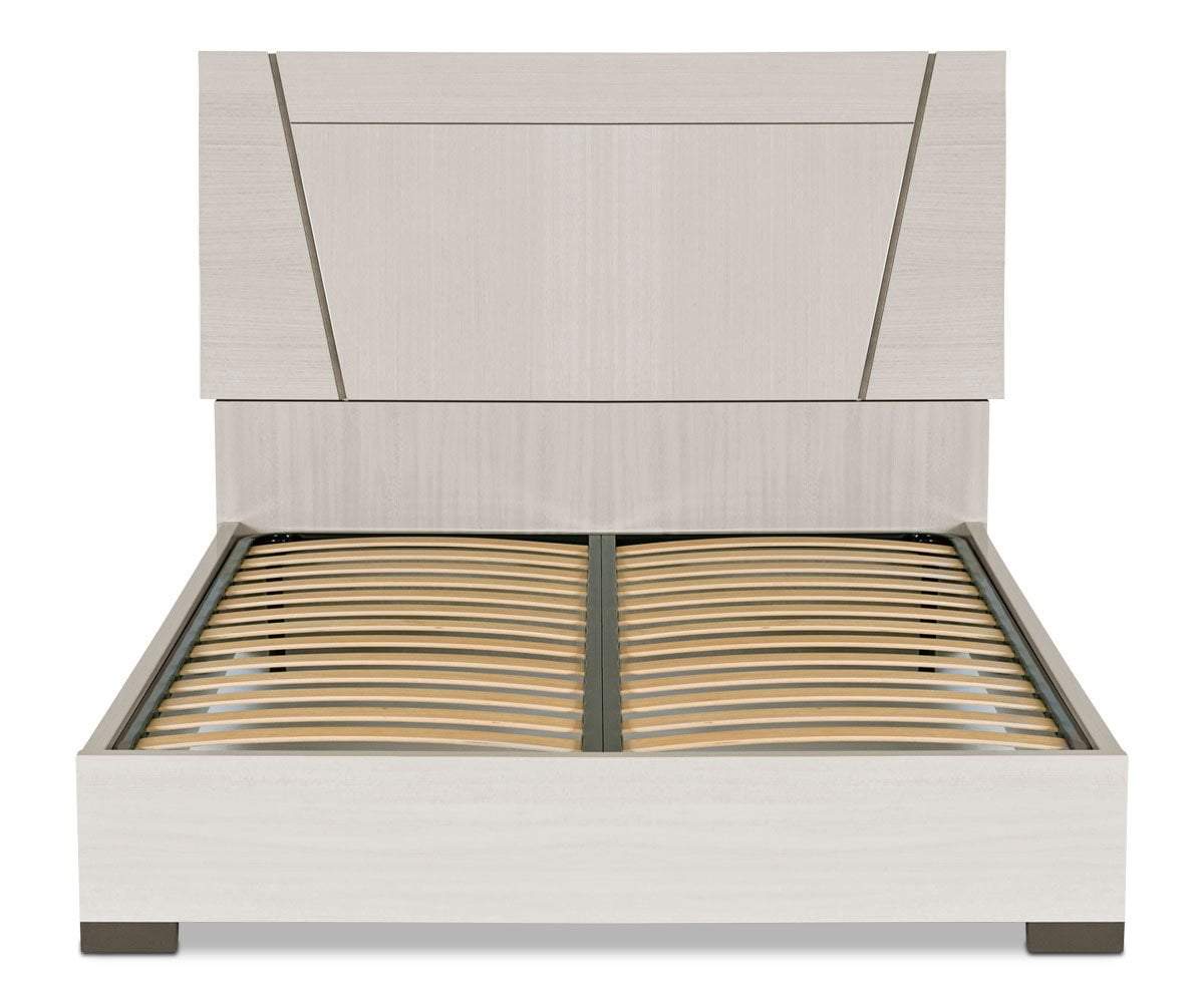 Elegant angles define the Monchiaro bed and create an instant focal point in your bedroom. The platform style bed and high headboard are constructed of a high-gloss, light grey koto wood veneer that will transform you room into an elegant oasis.Queen bed pictured.